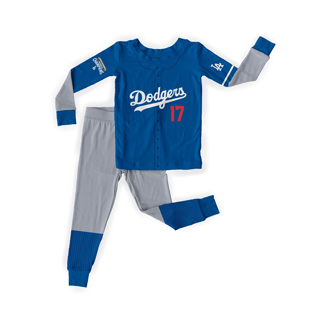 Haz que cada noche sea un home run. Con el emblema de los Dodgers al frente y el nombre de Shohei Ohtani en la espalda, esta pijama es perfecta para niños apasionados por el béisbol.